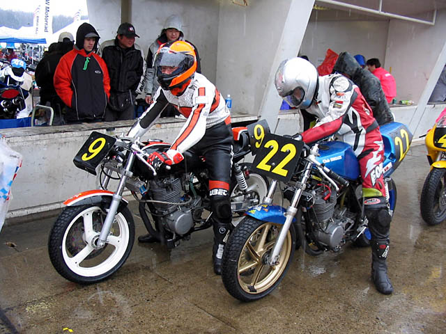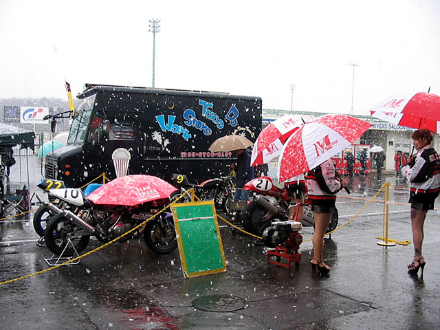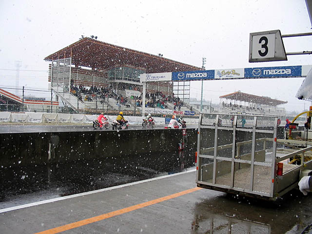 キャブセットの変更をしていると、他クラスの予選ではどうやら雪が…
