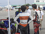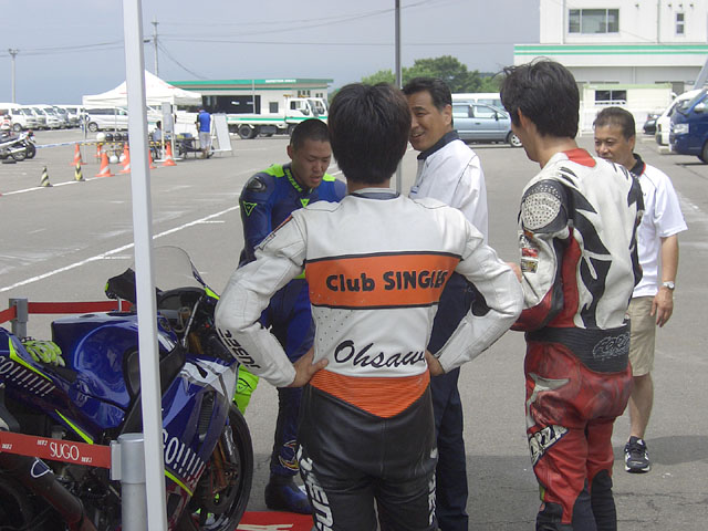同行したロッシファンの R46鈴K君は、新品のロッシ・レプリカスーツとブーツが平校長の目に留まったようで、