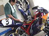 決勝のウエイティングしているとき、オーサーさんがナニヤラ自分の SR のケツ下を覗いています。