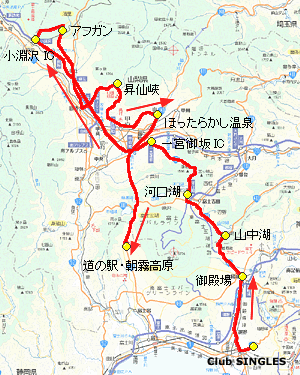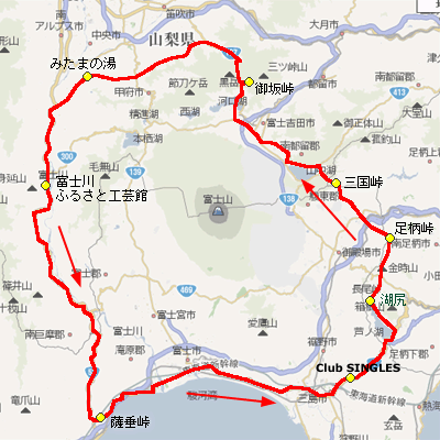 クラブシングルス →(三島市内)→(R246)→ 御殿場 →(R138) 集合時間 : 6:30 (店舗前) 6:45 に出発します。ガソリン満タンで集合してください |