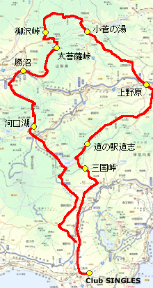 クラブシングルス →(三島市内)→(R246)→ 御殿場 →三国峠 集合時間 : 6:00 出発 (10分前までに集合) |