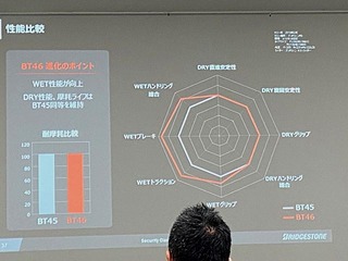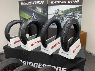 注目の新製品はRS10の後継ハイグリップラジアル「RS11」とレーシング18インチラジアル「CR11」、BT45後継のツーリングバイアス「BT46」、エンデューロ(競技用)のバトルクロス「E50エクストリーム」だ。